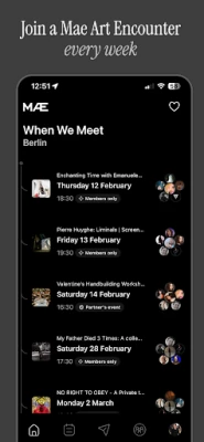 Mae je kurátorský sociálny umelecký klub, kde sa stretáva kreativita, komunita a kultúra. Objavte inšpiratívne zážitky, spojte sa s podobne zmýšľajúcimi tvorcami a vyjadrite svoj umelecký hlas. Mae ponúka vybraný program stretnutí a akcií, ktoré obohacujú vaše umelecké vnímanie a podporujú zmysluplné spojenia v oblasti umenia a kultúry.