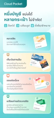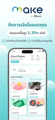 MAKE by KBank revolučne mení spôsob, akým pristupujete k osobným financiám. Táto inteligentná aplikácia je navrhnutá tak, aby správa peňazí bola nielen jednoduchá, ale aj príjemná a efektívna. Srdcom aplikácie je inovatívna funkcia Cloud Pocket, ktorá vám umožní rozdeliť si peniaze do rôznych digitálnych „vreciek" podľa vašich potrieb a cieľov. Môžete si nastaviť vlastné názvy, pridať obrázky, zamknúť svoje úspory alebo dokonca pozvať priateľov, aby sa spoločne podieľali na dosahovaní finančných mét.