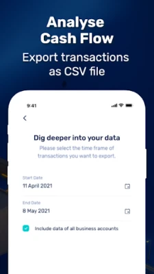 Majte neustálu kontrolu nad peňažnými tokmi a fakturáciou. Vďaka integrovanému nástroju na fakturáciu môžete jednoducho vytvárať, prispôsobovať a efektívne sledovať splatnosti priamo v prostredí, kde spravujete svoje bankové služby. Pre detailnú analýzu výdavkov firmy si môžete ľahko exportovať históriu transakcií do formátu CSV a otvoriť ju v preferovanom tabuľkovom procesore. Ak máte prebytočné finančné prostriedky, investujte ich jednoducho do viazaných vkladov priamo z vášho mobilného zariadenia, čo predstavuje efektívny spôsob zhodnocovania kapitálu.